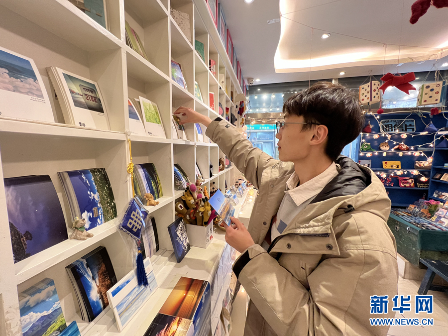 藍(lán)色的青海湖、金色的油菜花海、宛若明鏡的茶卡鹽湖……在青海省西寧市城中區(qū)莫家街一家文創(chuàng)小店里,來自山東青島的游客張開心正在店里挑選明信片。