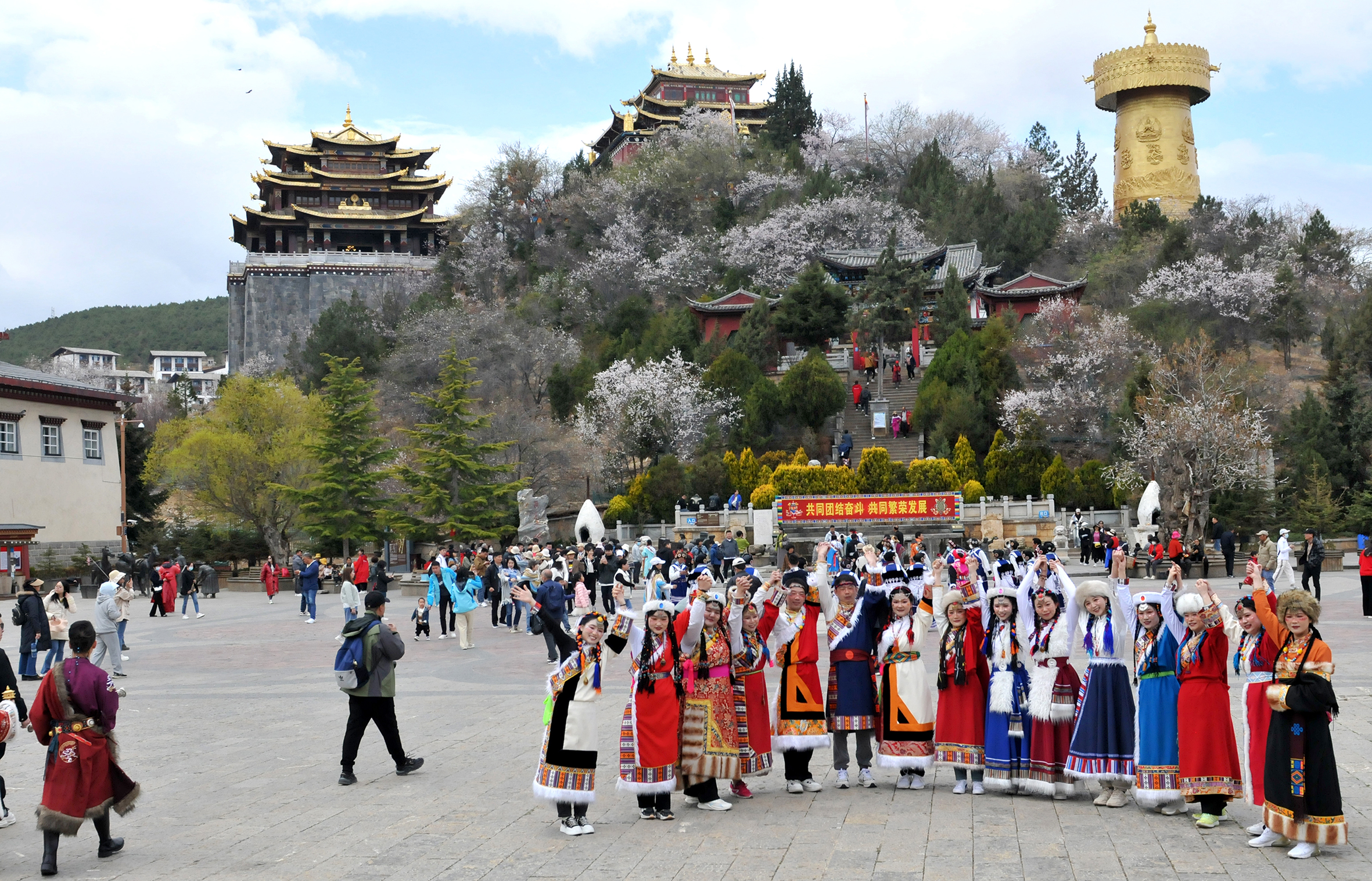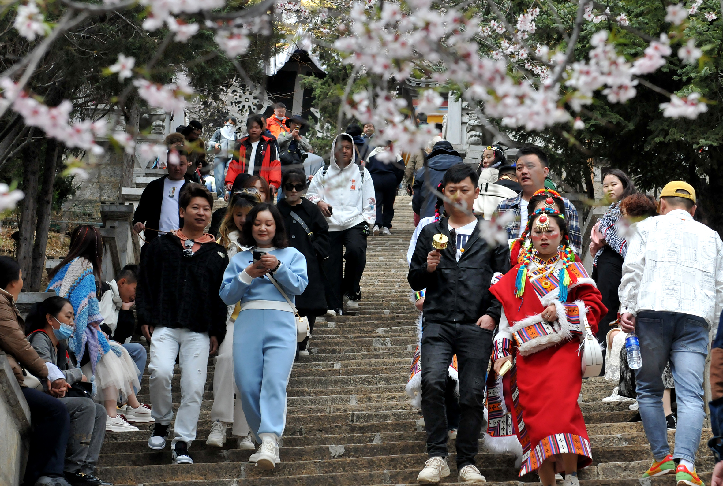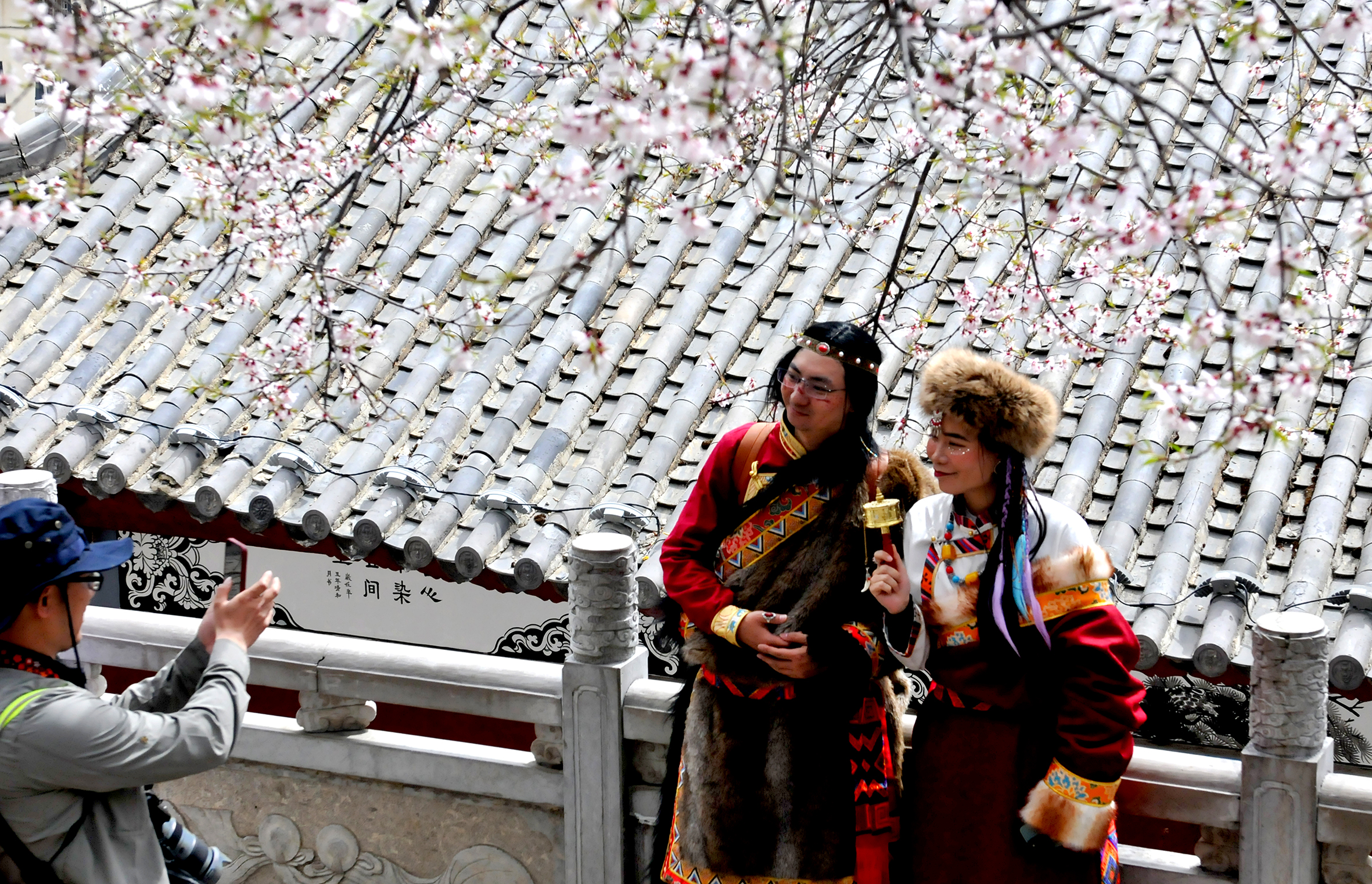 4月以來,香格里拉市獨克宗古城龜山公園里的毛桃花漸次開放,給本來就火熱的古城旅游帶來新的觀賞點。游人們在此賞花、體驗民俗,其樂融融。