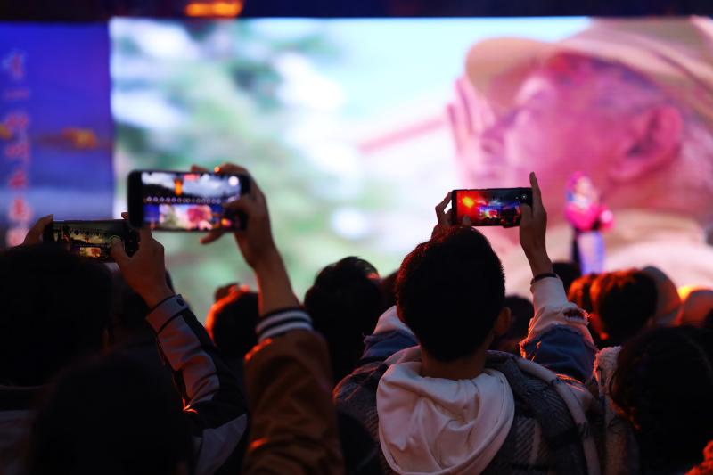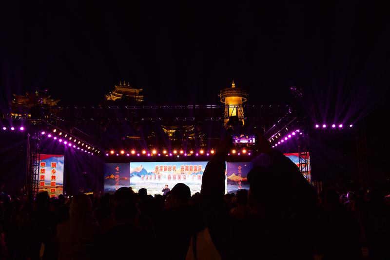 演唱會結(jié)束后,“彩云之南等你來”世界的香格里拉歡迎您——夜間群眾文藝演出活動隨即開始,現(xiàn)場燈光閃爍,游客與當(dāng)?shù)厝罕娨黄穑瑖鴱V場中央的篝火載歌載舞,盡情體驗縱情舞蹈的歡樂。