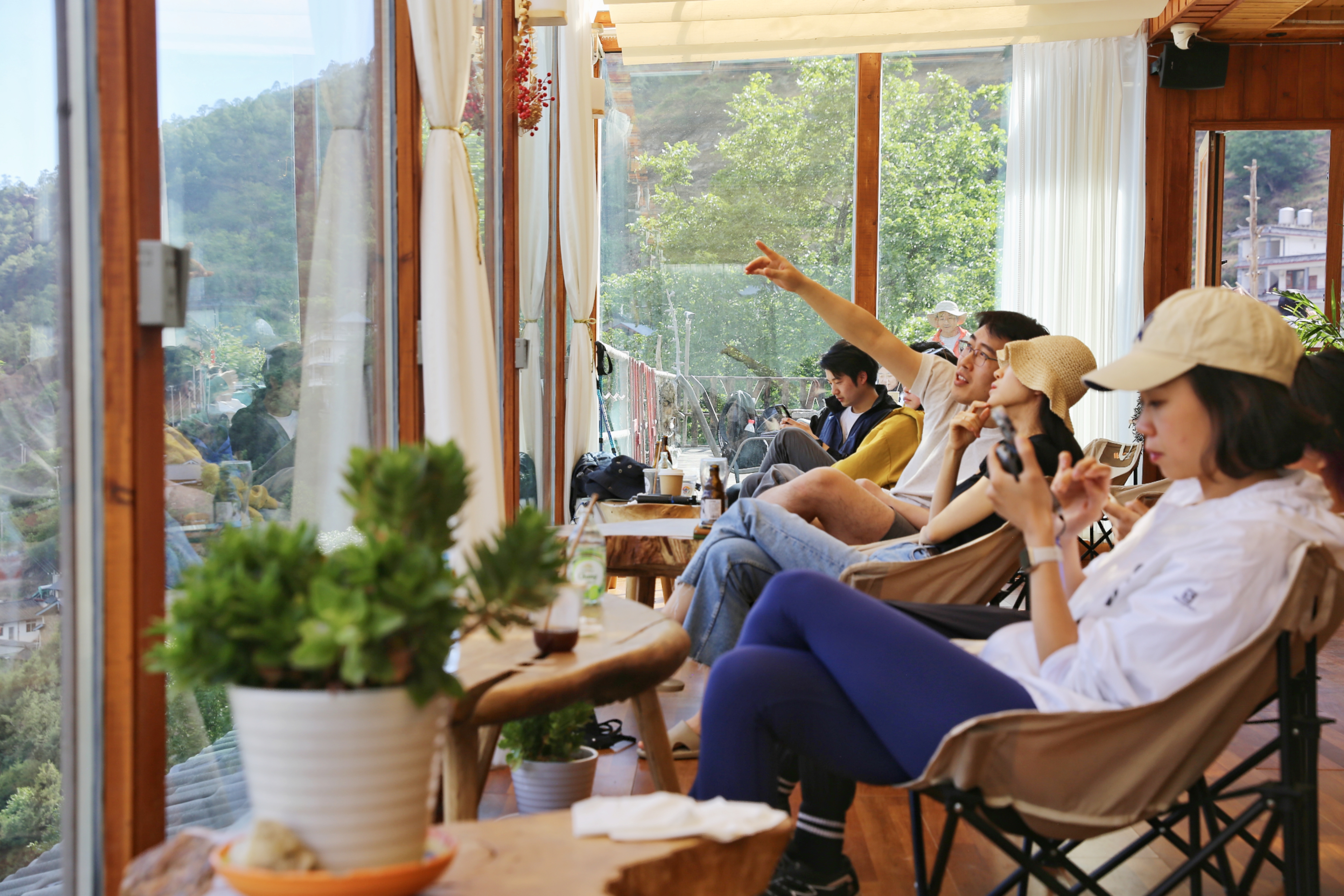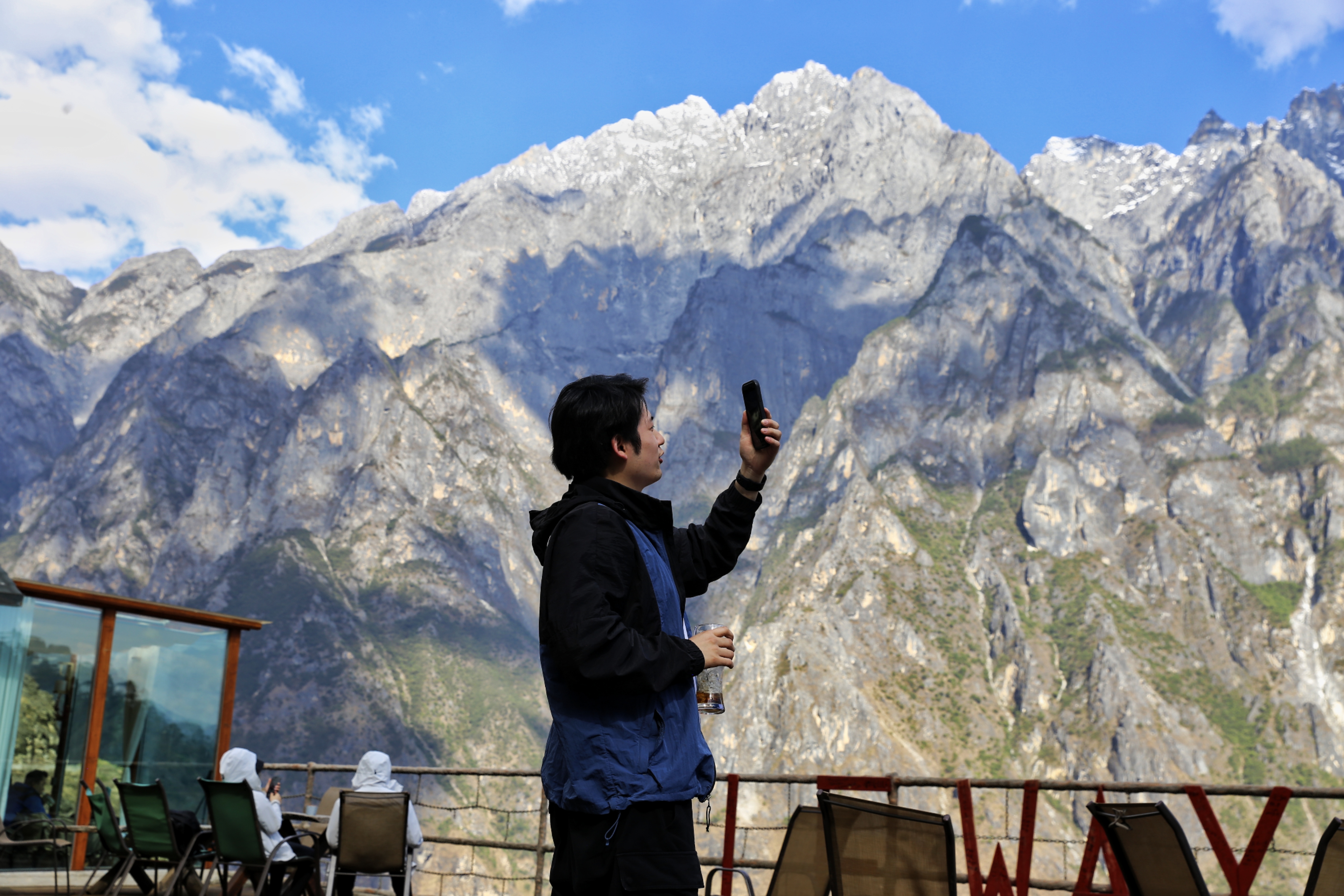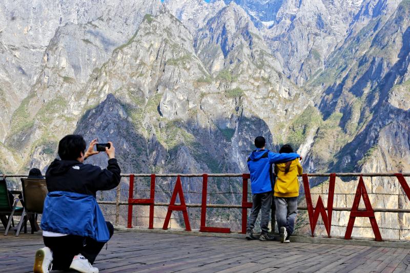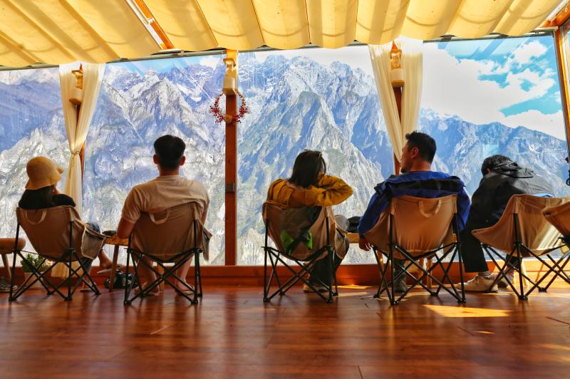 5月17日,游客在香格拉里市虎跳峽高路徒步線路中途客棧小憩,欣賞雪山峽谷壯美景色?;⑻鴯{高路徒步路線為“世界十大經(jīng)典徒步路線之一”,全長20公里左右,該路線以險、奇、秀著稱。路線位于哈巴雪山山麓,腳下金沙江水奔涌而過,對岸是聳立入云的玉龍雪山,一路叢林、峽谷、古道、瀑布等景色美不勝收,每年吸引著數(shù)萬名國內(nèi)外的驢友來此徒步。