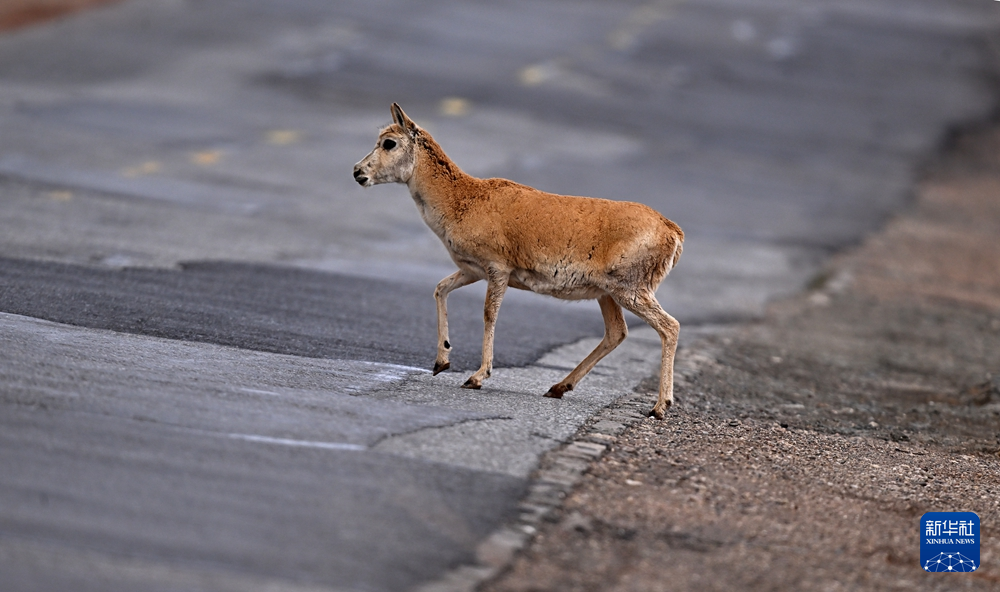 5月28日,在青??煽晌骼?,一只雌性待產(chǎn)藏羚羊通過青藏公路。新華社記者 張宏祥 攝