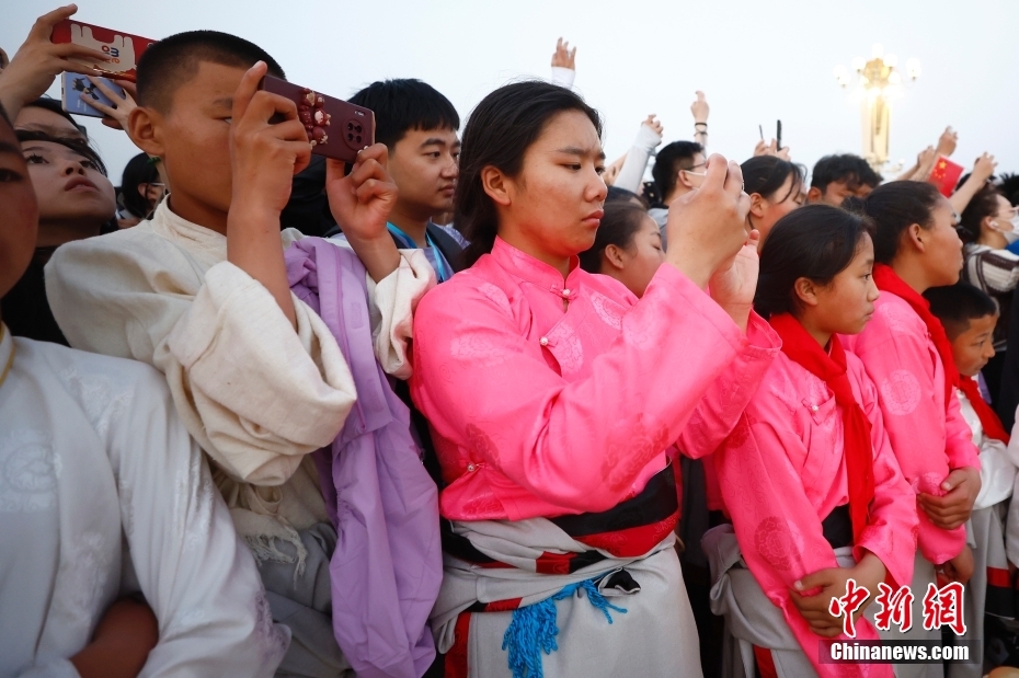 圖為觀看升旗儀式的藏族青少年。中新社記者 富田 攝