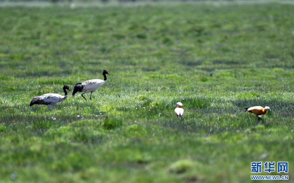 兩只黑頸鶴在青海隆寶國家級自然保護(hù)區(qū)內(nèi)活動(dòng)。新華社記者 韓方方 攝
