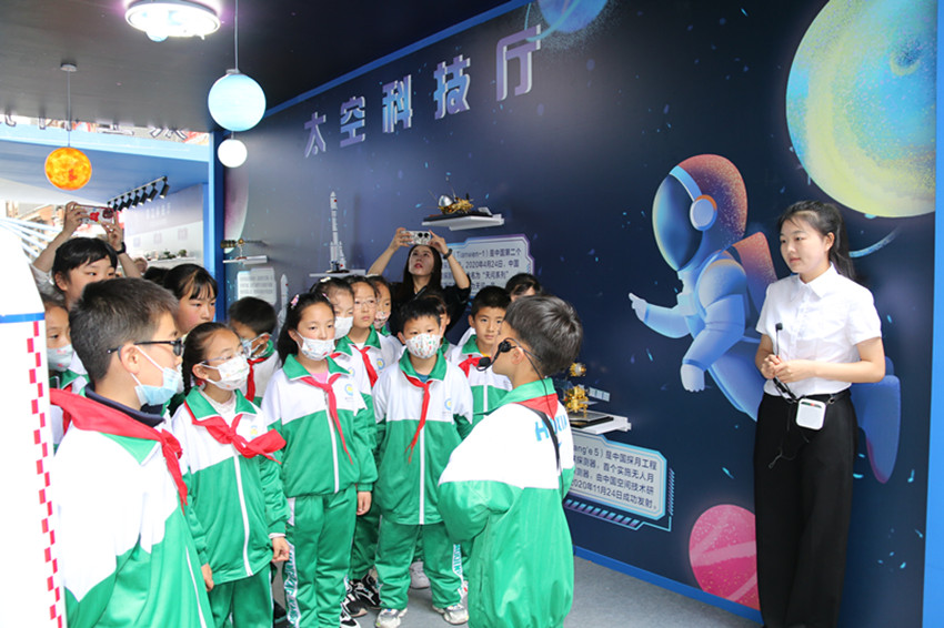 “航天夢是中國夢、華夏夢,神舟十六號載人飛船發(fā)射成功并進入預定軌道。古人仰望星空,幻想上天攬月的夢想,在一代代中國航天人的努力下逐漸變?yōu)榱爽F實?!薄凹t領巾”講解員劉嘉沐在解說他負責的天空科技廳時,將這一喜訊分享給了在場的同學們?!跋M芙枭裰凼栞d人飛船發(fā)射成功的機會,在科普周活動中普及航天知識,讓更多的學生深入了解航天文化,引導青少年傳承航天精神、點燃航天夢想?!敝菘茀f(xié)負責人告訴記者。