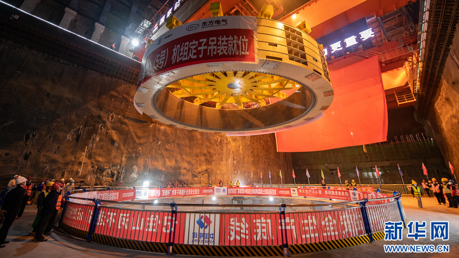 6月30日,瑪爾擋水電站地下廠房內(nèi),工作人員正在進(jìn)行首臺(tái)機(jī)組定子吊裝作業(yè)。新華網(wǎng) 潘彬彬 攝
