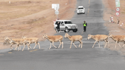 而在青藏公路這頭,可可西里管理處安排工作人員采取短暫交通管制、禁止鳴笛、巡護救助等措施,為藏羚羊遷徙產(chǎn)仔保駕護航。伴隨遷徙高峰期的到來,藏羚羊“過公路”已經(jīng)成為青藏公路沿線的一道獨特風景。