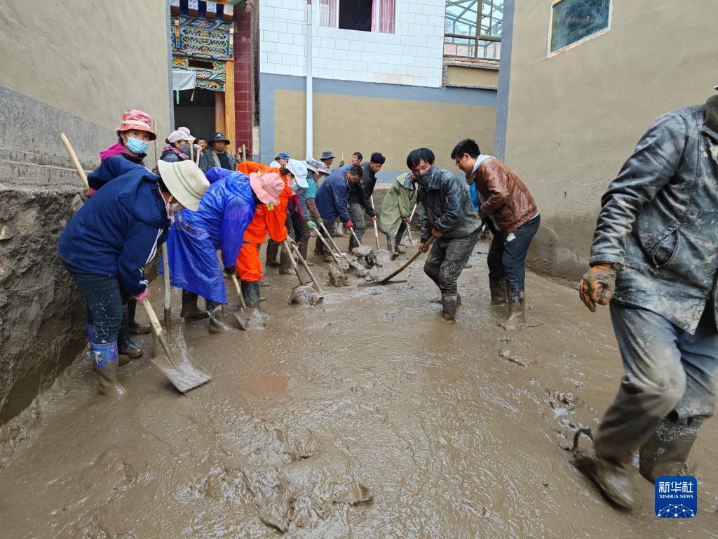 7月11日,在甘肅省甘南藏族自治州夏河縣麻當(dāng)鎮(zhèn),當(dāng)?shù)亟M織力量進行清淤。新華社發(fā)(甘南州委宣傳部供圖)
