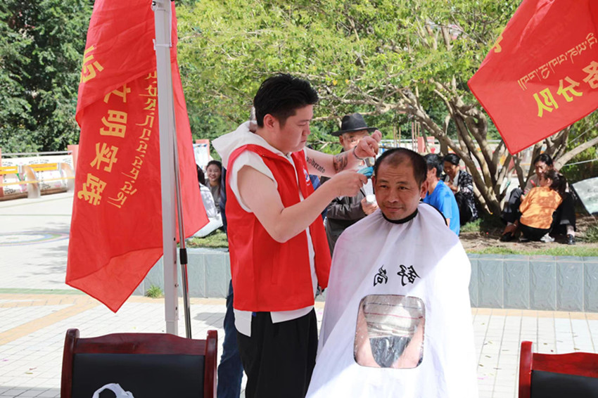 志愿者為群眾義務(wù)理發(fā)。