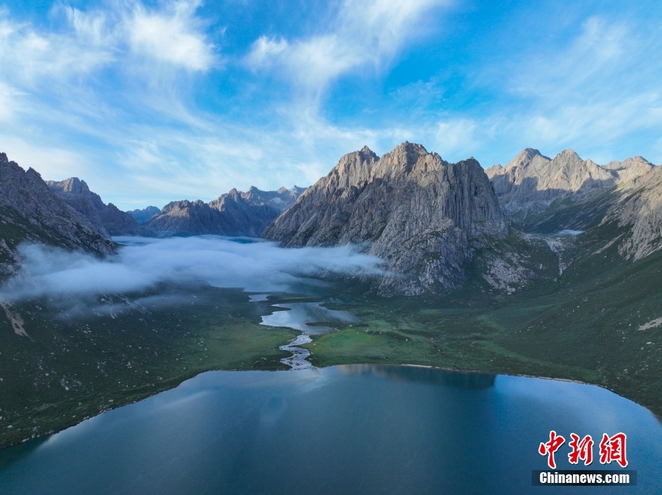 7月19日,盛夏時(shí)節(jié),青海省果洛藏族自治州久治縣年保玉則山間云霧繚繞,山下鮮花盛開(kāi),水清草豐,靜謐的湖水與嶙峋的山巒相映成趣,宛如仙境。年保玉則總面積3469平方公里,山形如蓮花,保存有冰蝕地貌、冰磧地貌、現(xiàn)代冰川等地質(zhì)遺跡。(無(wú)人機(jī)照片)中新社記者 馬銘言 攝