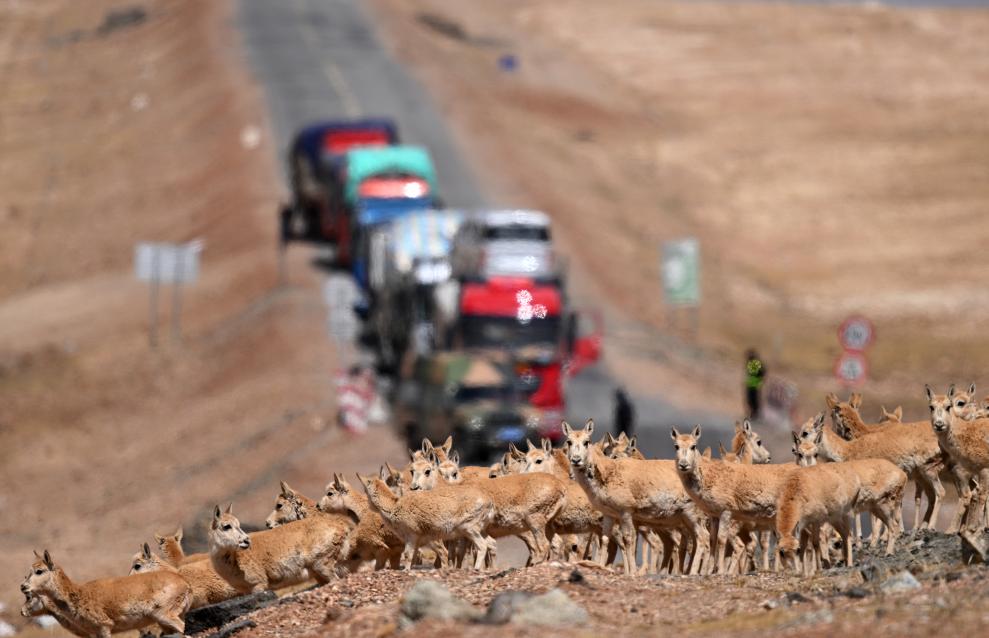 遷徙產(chǎn)仔季,在可可西里五道梁保護(hù)站附近,記者經(jīng)??吹?,成群的雌性藏羚羊,在頭羊帶領(lǐng)下,邁著小碎步,整齊而迅速地穿過(guò)青藏公路。往來(lái)車輛在工作人員指揮下排起長(zhǎng)長(zhǎng)的隊(duì)伍,沒(méi)有鳴笛、沒(méi)有圍觀,只有讓行,一切如此自然。