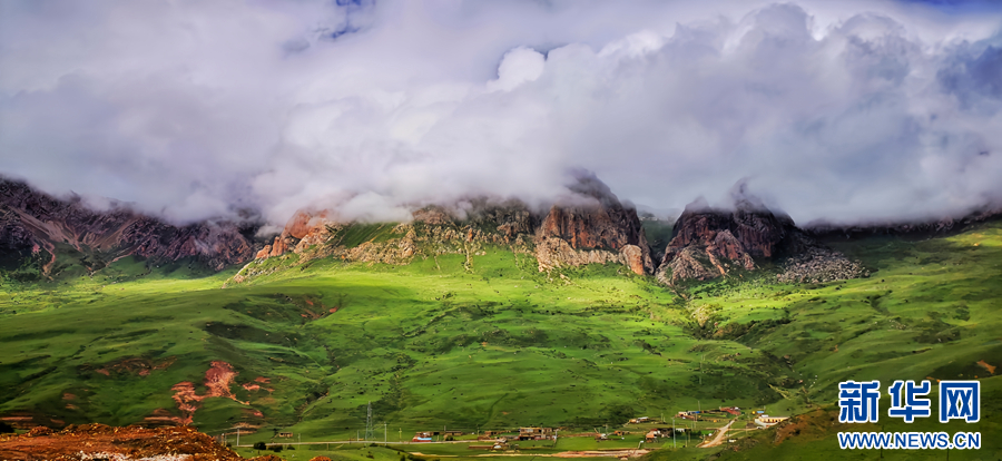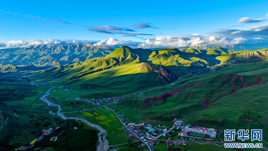 時值盛夏,青海省玉樹藏族自治州景色怡人,群山和草原在藍天白云的映襯下構(gòu)成壯美的畫卷。