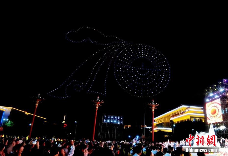 無(wú)人機(jī)秀現(xiàn)場(chǎng),無(wú)人機(jī)組成“70”字樣。
