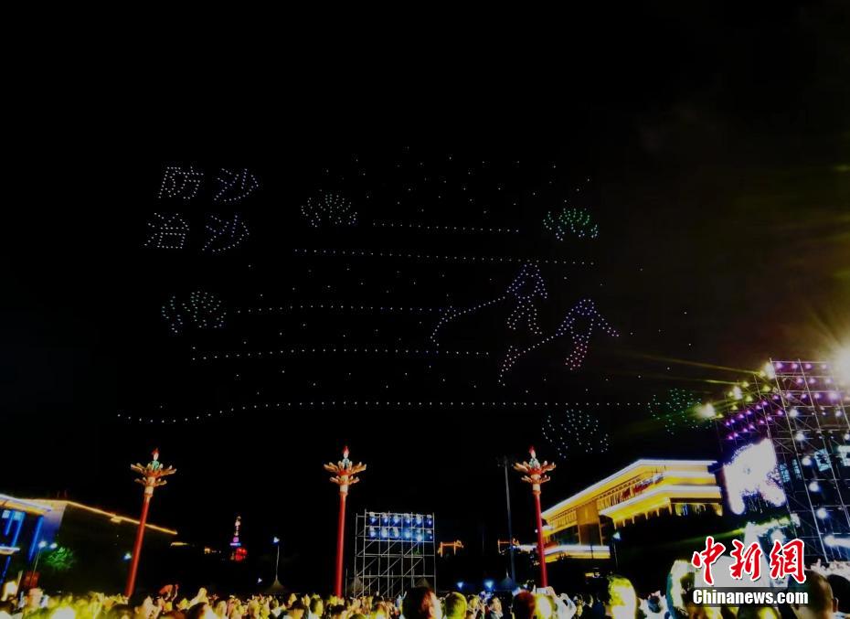 圖為無(wú)人機(jī)秀現(xiàn)場(chǎng),無(wú)人機(jī)組成“防沙治沙”字樣。祁增蓓 攝