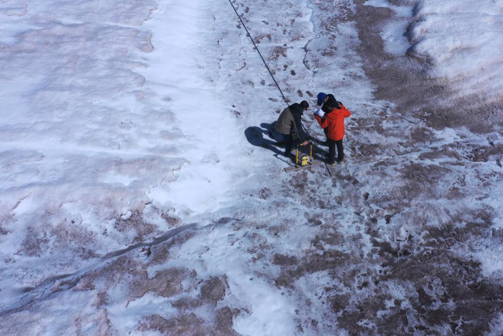 7月27日,范越(左一)和董士琦(左二)在長(zhǎng)江源區(qū)的冬克瑪?shù)妆ㄉ鲜褂玫刭|(zhì)雷達(dá)探測(cè)冰川厚度(無(wú)人機(jī)照片)。新華社記者 陳杰 攝