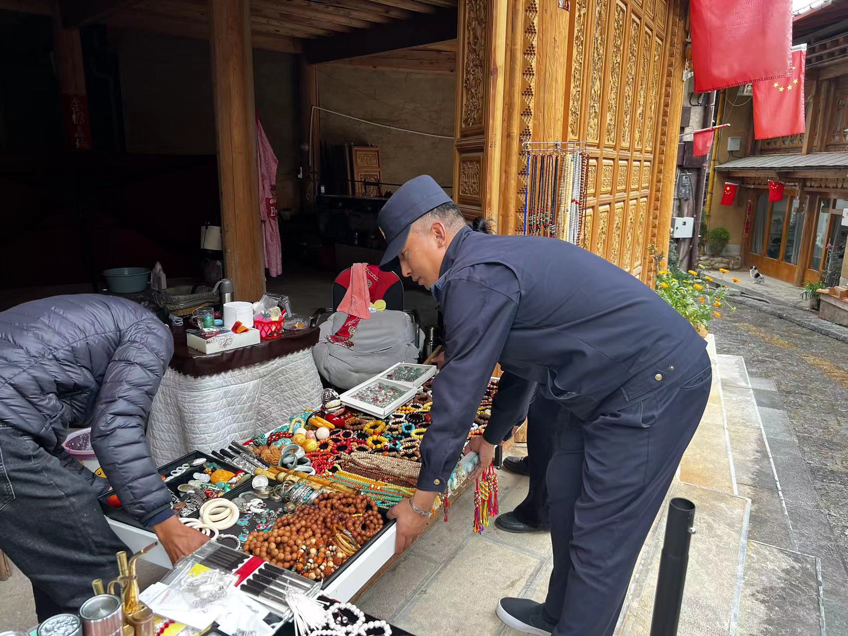 整治過程中,綜合行政執(zhí)法人員全天候無縫巡查,重點對出店經(jīng)營、占道經(jīng)營、亂停亂放、流動攤販無序擺攤等問題進行整治。排查月光廣場等公共區(qū)域擺攤?cè)藛T,凡屬古城內(nèi)商戶的一律要求返回店內(nèi)買賣;屬于流動攤販的及時引導至劃定的攤位;對古城內(nèi)所有亂停亂放的機動車和非機動車,及時找到使用人,要求停放至指定區(qū)域,確保游客出行更加方便,市容更加整潔有序。圖為綜合行政執(zhí)法人員在勸導占道經(jīng)營攤點。