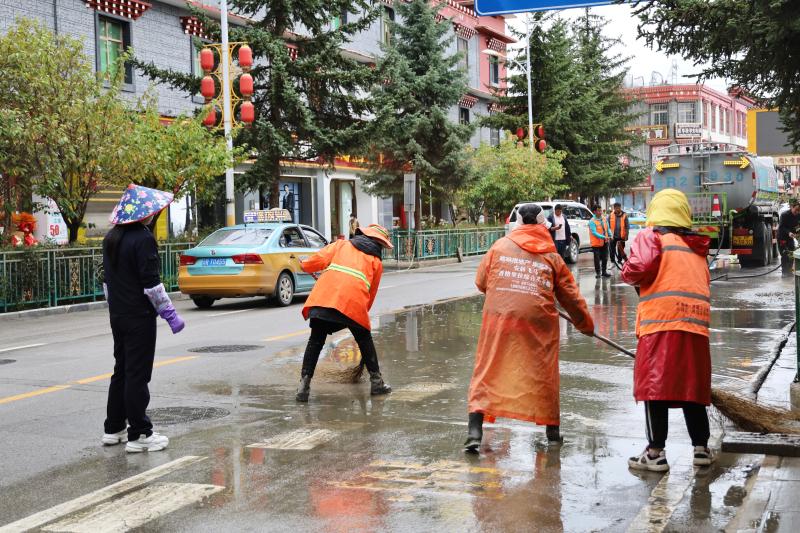 為盡快恢復(fù)城區(qū)潔凈容貌,香格里拉市和祥環(huán)??萍加邢挢?zé)任公司立即組織環(huán)衛(wèi)工人30名,抽調(diào)高壓水車2輛、掃地車4輛,積極開展道路清淤工作,同時(shí)對(duì)下水道水口周邊的樹枝、雜物等進(jìn)行清理清運(yùn)。經(jīng)過近五小時(shí)的連續(xù)作業(yè),成功恢復(fù)道路暢通整潔。