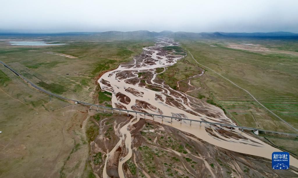 青藏鐵路跨過尕爾曲的辮狀河道(7月27日攝,無人機照片)。新華社記者 劉詩平 攝
