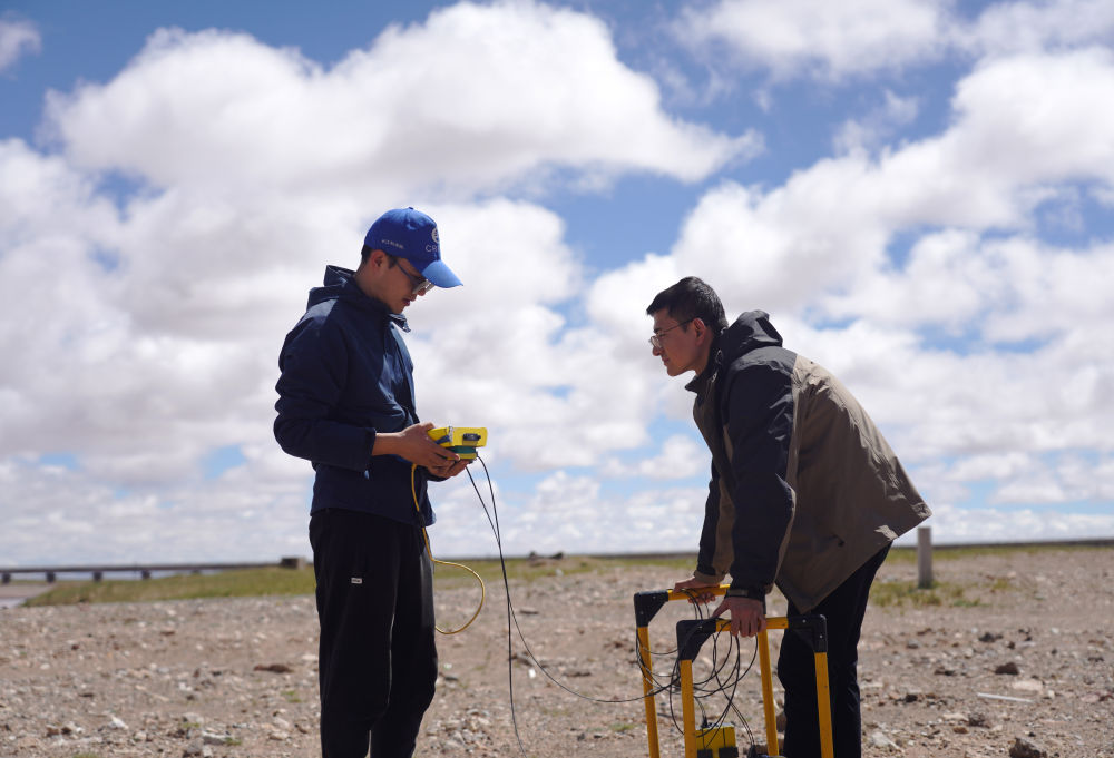 科考隊員董士琦(左)和范越在長江北源楚瑪爾河附近進行地質(zhì)雷達(dá)探測(7月29日攝)。新華社記者 陳杰 攝