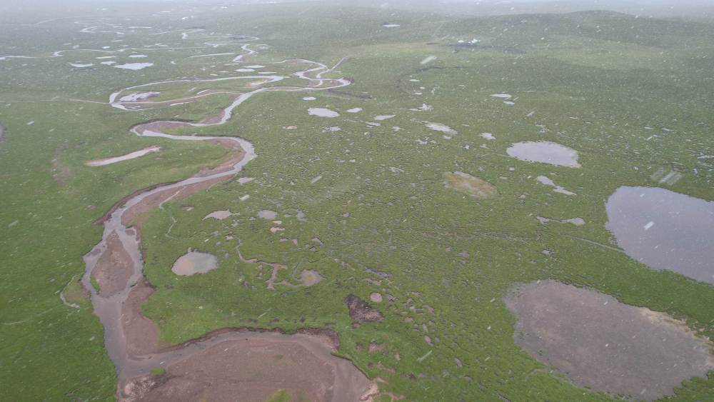 風(fēng)雪彌漫中的當(dāng)曲濕地(7月24日攝,無人機照片)。新華社記者 劉詩平 攝