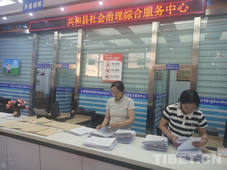 圖為青海省海南藏族自治州共和縣社會治理綜合服務(wù)中心工作人員為群眾進(jìn)行調(diào)解
