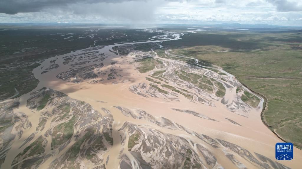 沱沱河與當(dāng)曲匯合處的囊極巴隴,辮狀河道寬度超過3千米(7月26日攝,無人機照片)。 新華社記者 劉詩平 攝