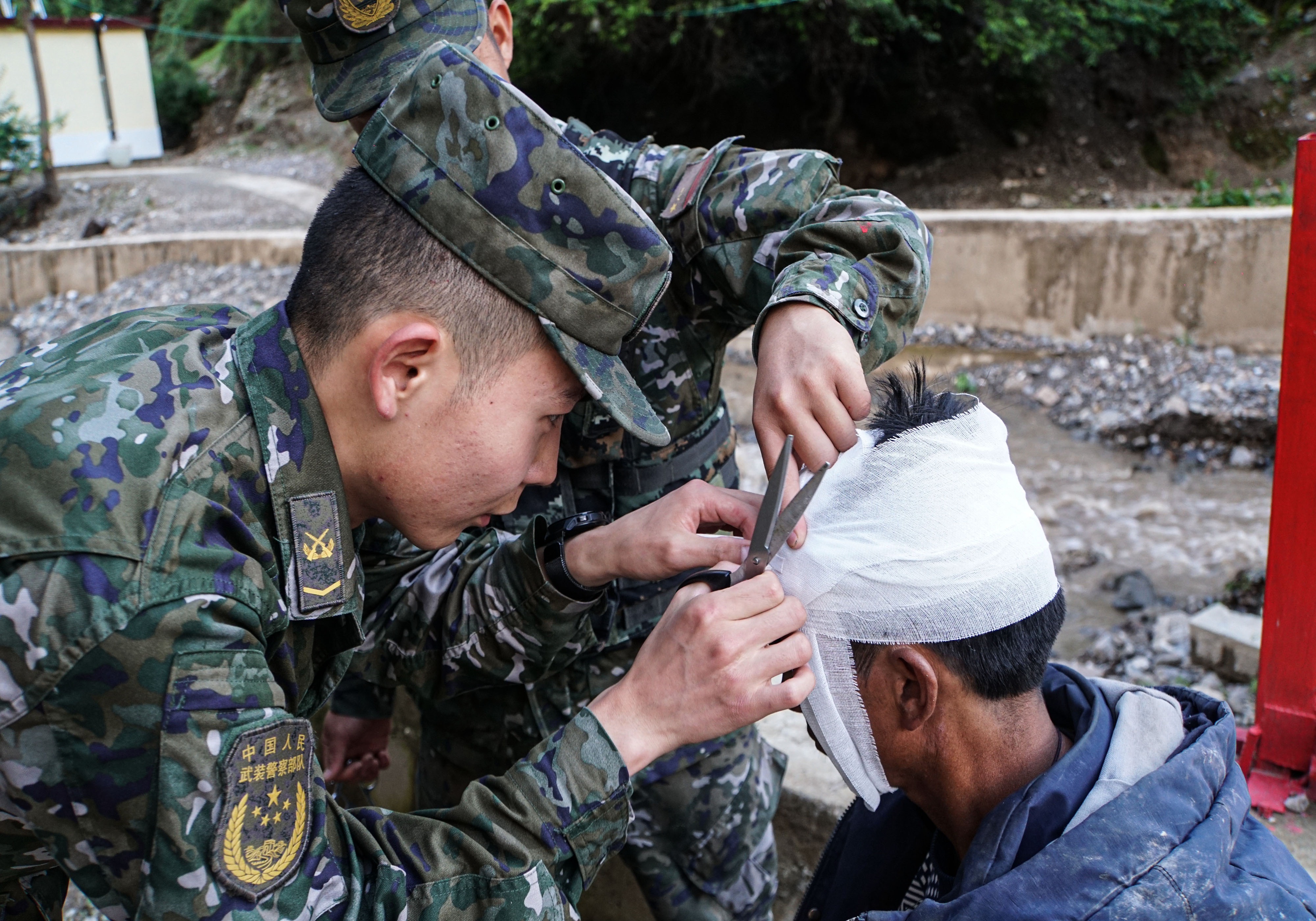 “同志,不要怕,我們是武警官兵,我們先給你處理傷口?!?甕云飛一邊安撫受傷群眾的情緒,一邊為他消毒止血、包扎傷口。后經(jīng)檢查,該群眾除了頭部有輕微皮外傷外,全身并無大礙。之后,中隊官兵又和當(dāng)?shù)厝罕娨黄鹜度胲囕v緊急救援,經(jīng)過幾個小時的努力,大家齊心協(xié)力將貨車拖至安全地帶。