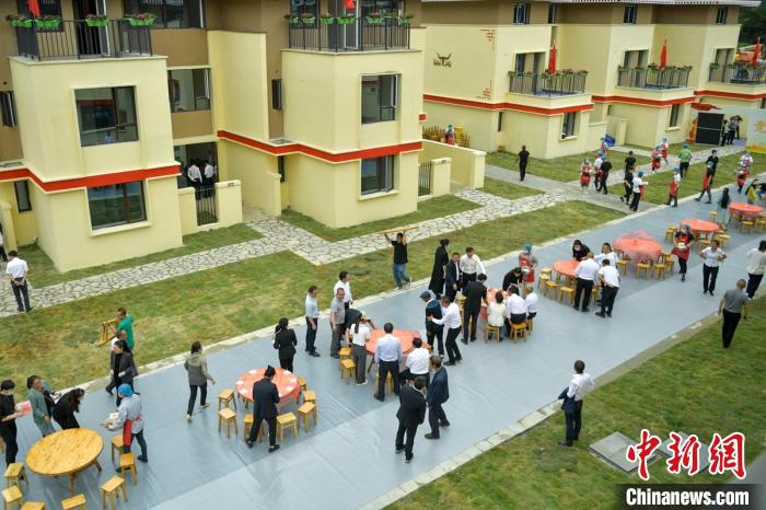 瀘定縣磨西鎮(zhèn)大杉樹村(幸福新村)集中安置點領(lǐng)取新房鑰匙后,村民們正在擺壩壩宴。中新網(wǎng)記者 劉忠俊 攝