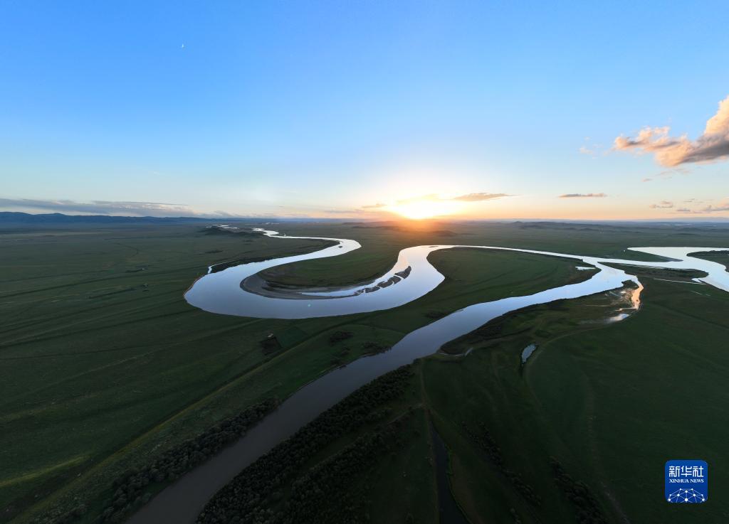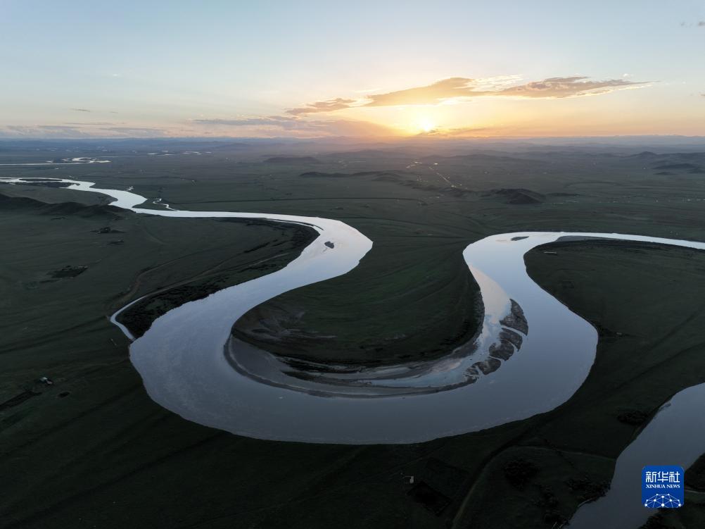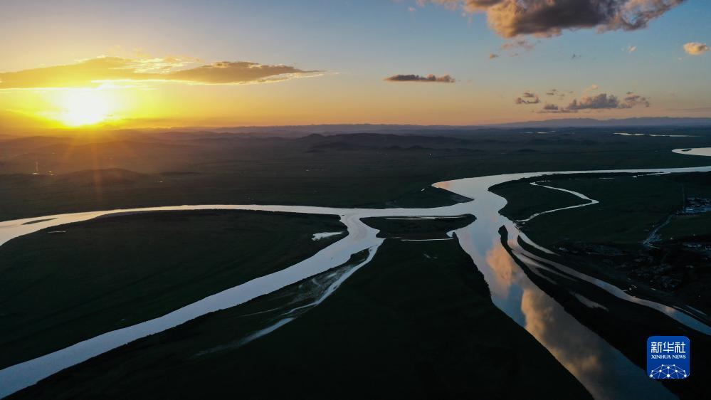 這是8月21日在四川省阿壩藏族羌族自治州若爾蓋縣唐克鎮(zhèn)拍攝的黃河九曲第一灣落日(無人機(jī)照片)。新華社記者 邢廣利 攝