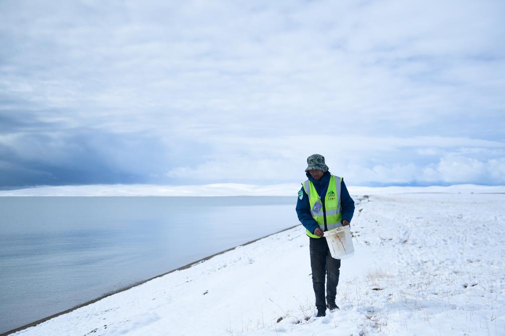 2021年10月20日,在青海省果洛藏族自治州瑪多縣扎陵湖鄉(xiāng)勒那村,三江源國(guó)家公園黃河源園區(qū)生態(tài)管護(hù)員在扎陵湖邊撿拾垃圾。新華社記者張龍 攝
