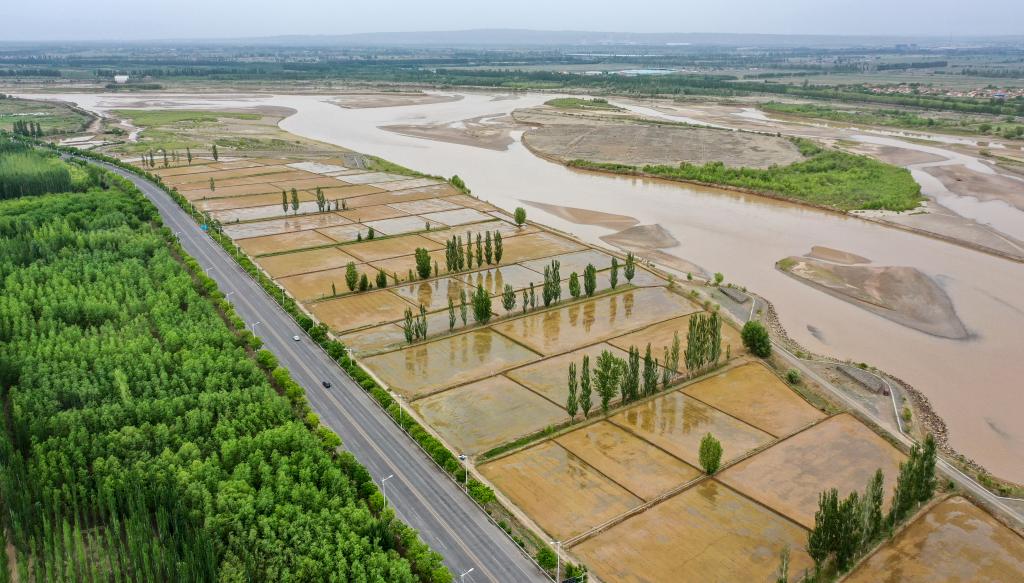 流經(jīng)寧夏青銅峽市境內(nèi)的黃河,滋潤(rùn)著岸邊水稻和各種植被(無(wú)人機(jī)照片,5月25日攝)。新華社記者馮開華 攝