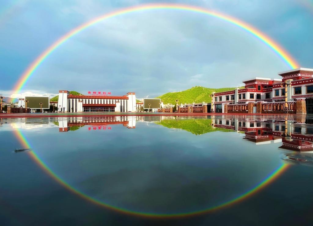 9月18日,彩虹下的滇藏鐵路麗香段香格里拉站。(中國鐵路昆明局集團(tuán)公司供圖)