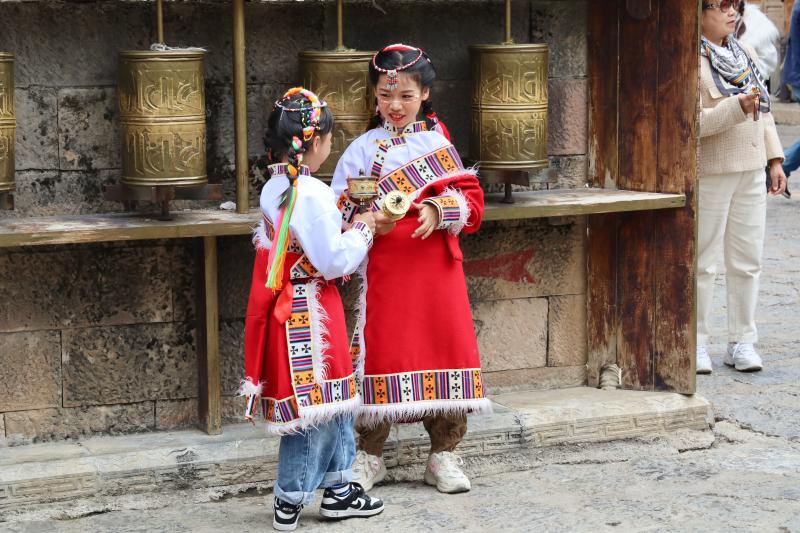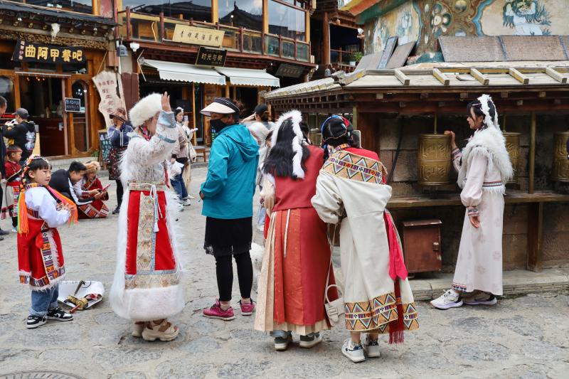 長假期間,獨克宗古城又掀起旅拍熱。走在獨克宗古城里,隨處可見身著藏族服飾、妝容精致的俊男靚女。“一梵攝影”店內(nèi),選服飾、選配飾、做妝造......來來往往的顧客絡(luò)繹不絕,“最近每天服務(wù)單數(shù)在四五十單左右,是長假之前的一倍多。”一梵攝影的負(fù)責(zé)人說道。經(jīng)過化妝造型,游客們即刻變身美麗帥氣的卓瑪扎西,獨具民族特色的造型,配以古城的美景,深受游客的喜愛,大家紛紛以旅拍的方式給自己在旅途中留下一份美好的回憶。