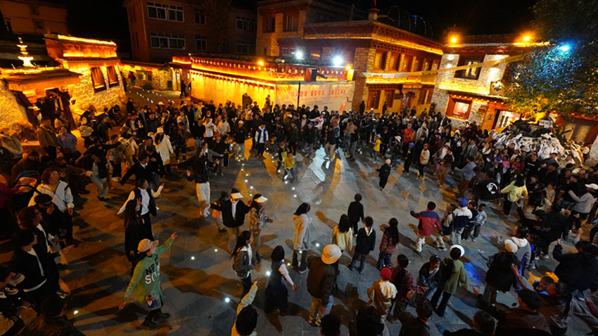 “加油、加油……”10月1日晚,在仁康小廣場(chǎng)上,遠(yuǎn)道而來(lái)的各地游客與理塘當(dāng)?shù)鼐用袢罕姸汲两诿袼谆顒?dòng)的歡樂(lè)節(jié)日氛圍中?,F(xiàn)場(chǎng)邀請(qǐng)游客進(jìn)行的三人拔河比賽,掀起了活動(dòng)高潮?!斑@里的氛圍讓我感到很舒服,也祝祖國(guó)母親生日快樂(lè)?!眮?lái)自陜西西安的游客黃家樂(lè)說(shuō)。伴隨著各族群眾手拉手跳起的鍋莊舞,游客和群眾深切感受到民族大團(tuán)結(jié)的溫暖。