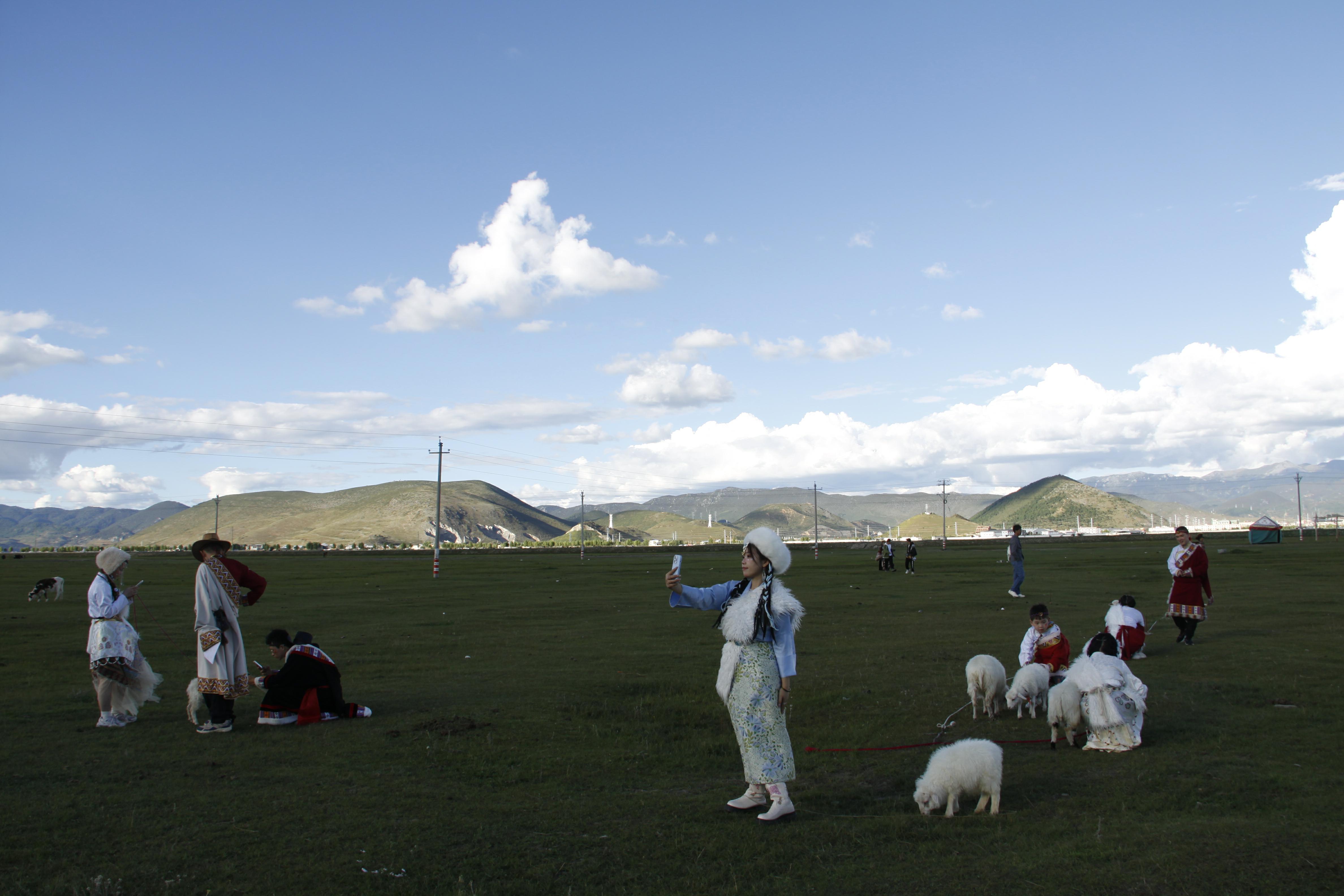 時下,迪慶高原秋景如畫。眾多游客紛紛到香格里拉市建塘草原打卡,在藍天白云下,有的騎馬賞景,有的身著民族服裝旅拍,還有的與小綿羊親密接觸,構成了一道道亮麗的風景線。