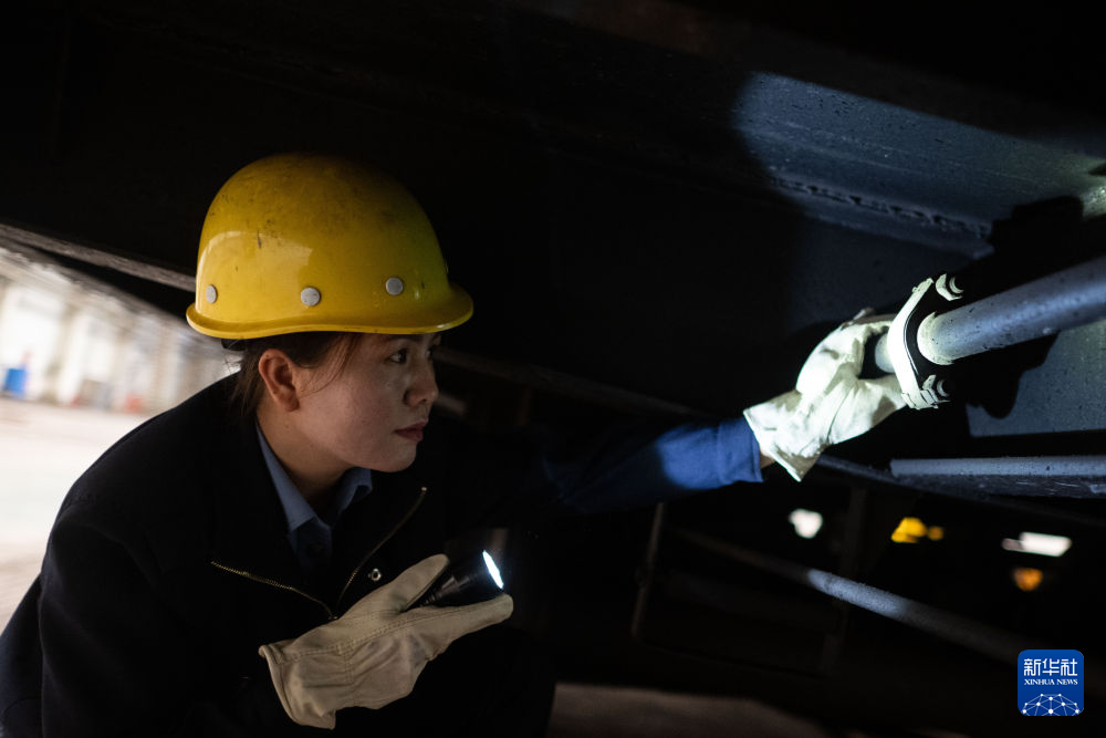 10月12日,在中國鐵路青藏集團(tuán)有限公司西寧東車輛段制動(dòng)班組,馬婷在檢查貨車車輛制動(dòng)軟管。新華社記者 張龍 攝
