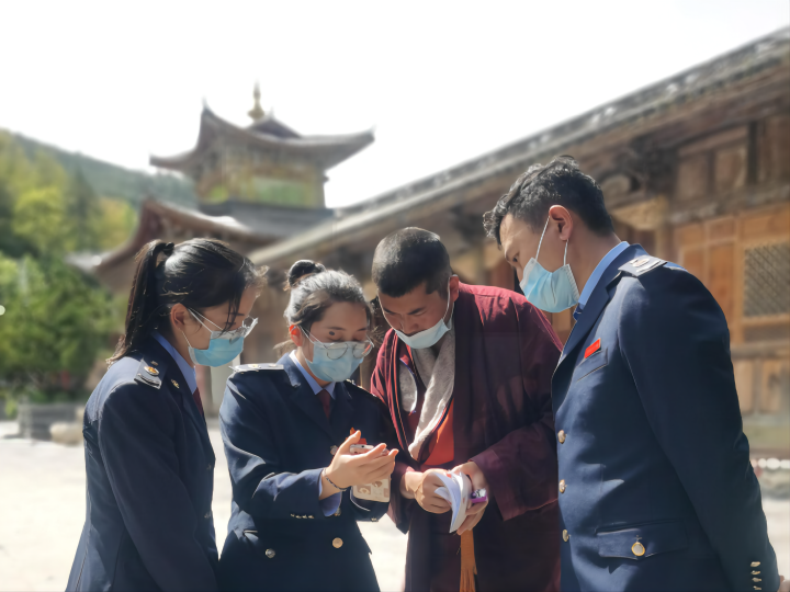 圖為縣稅務(wù)局“傈鄉(xiāng)稅宣小分隊”上門為壽國寺的藏傳佛教僧眾開展城鄉(xiāng)“兩險”手機繳納流程輔導(dǎo)和民族團(tuán)結(jié)進(jìn)步相關(guān)知識宣傳。