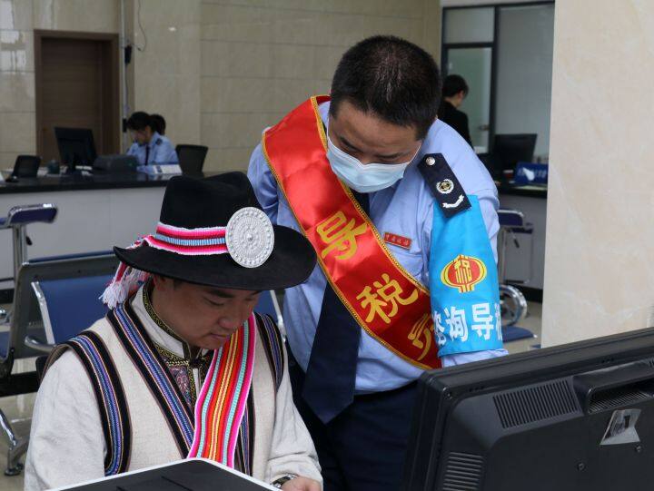 圖為在國家稅務(wù)總局維西傈僳族自治縣稅務(wù)局辦稅服務(wù)大廳,導(dǎo)稅員為前來辦理申報業(yè)務(wù)的傈僳族納稅人提供雙語業(yè)務(wù)輔導(dǎo)服務(wù)