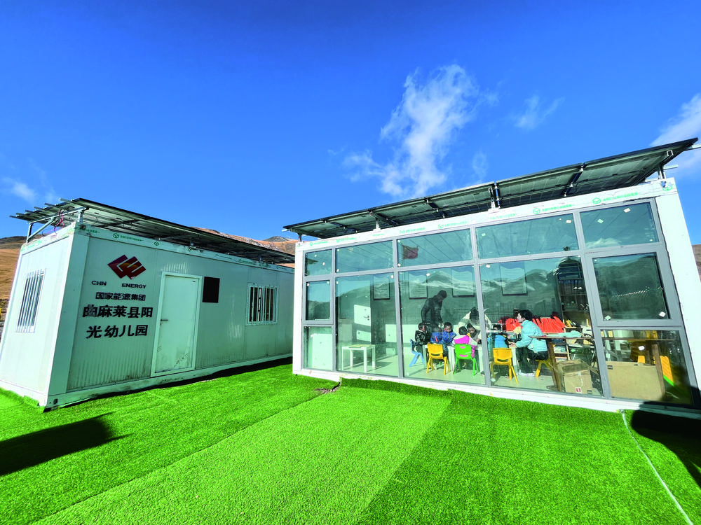“迷你”幼兒園由兩個(gè)集裝箱組成,箱頂裝有太陽(yáng)能光伏系統(tǒng),可以滿足供暖、照明等需求。兩個(gè)集裝箱分別是孩子們的教室和功能室。溫暖的陽(yáng)光透過(guò)一扇大大的落地窗照進(jìn)教室,孩子們和老師在里面一起看書(shū)學(xué)習(xí)做游戲,雖然室外寒風(fēng)凜冽,但教室內(nèi)卻非常溫暖。