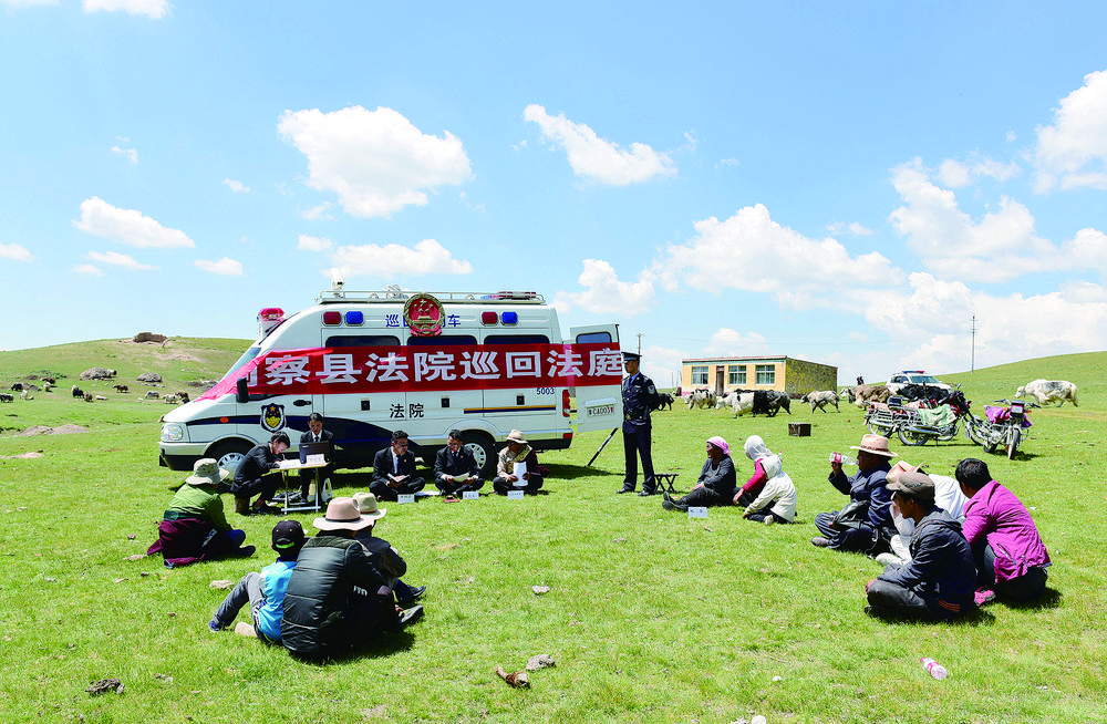 剛察縣人民法院利用巡回審判車,就地開庭審理草場糾紛。省高級人民法院供圖