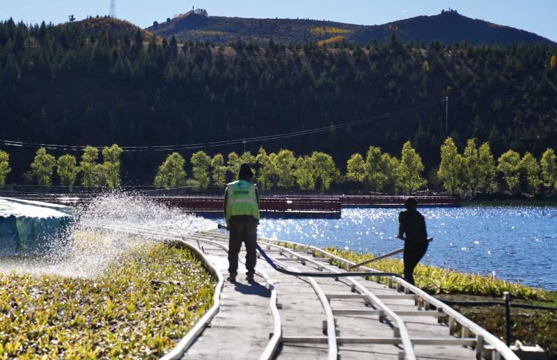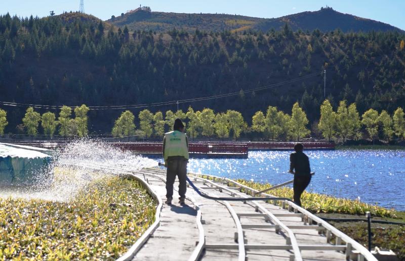 圖為工人在拉姆央措湖畔鋪設環(huán)湖步行棧道、鋪貼路面石板。目前,拉姆央措湖保護治理與生態(tài)修復基礎設施建設工程已完成總工程量的95%,正加緊推進路面石板鋪貼、木棧道安裝、吸煙亭改造等掃尾工作。拉姆央措湖水清景美煥新顏。