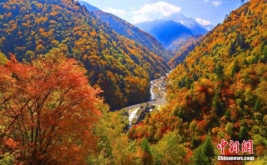深秋時節(jié),四川省阿壩州小金縣瑪嘉溝迎來一年中最美季節(jié),雪山、冰川、海子、針葉林、原始森林等在藍(lán)天白云下變得色彩斑斕,層林盡染,已是一幅半山彩林半山雪的壯觀景象。陳邦亮 攝