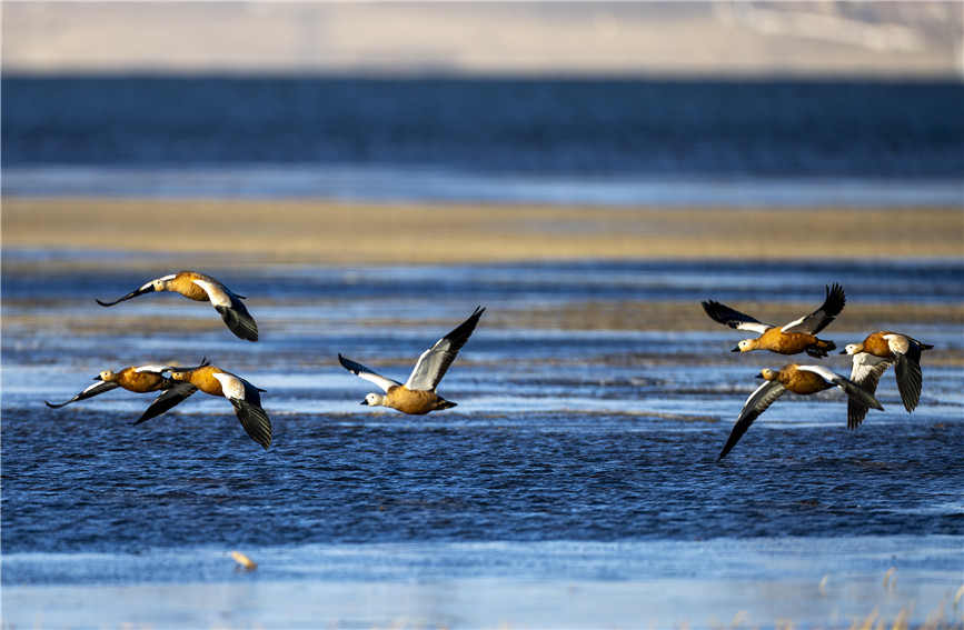 湖面上成群結(jié)隊的赤麻鴨紛紛翔集,時而靜臥水面,時而振翅齊飛、時而追逐嬉戲、時而潛水覓食,場面蔚為壯觀,為初冬的青海湖帶來了美麗的色彩和無限生機。