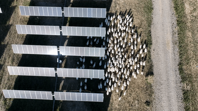 在深藍(lán)色的光伏板下,郁郁蔥蔥的牧草向上生長,園區(qū)里的“光伏羊”啃食青草,奔跑追逐,成為當(dāng)?shù)匾瞬毮康娘L(fēng)景。