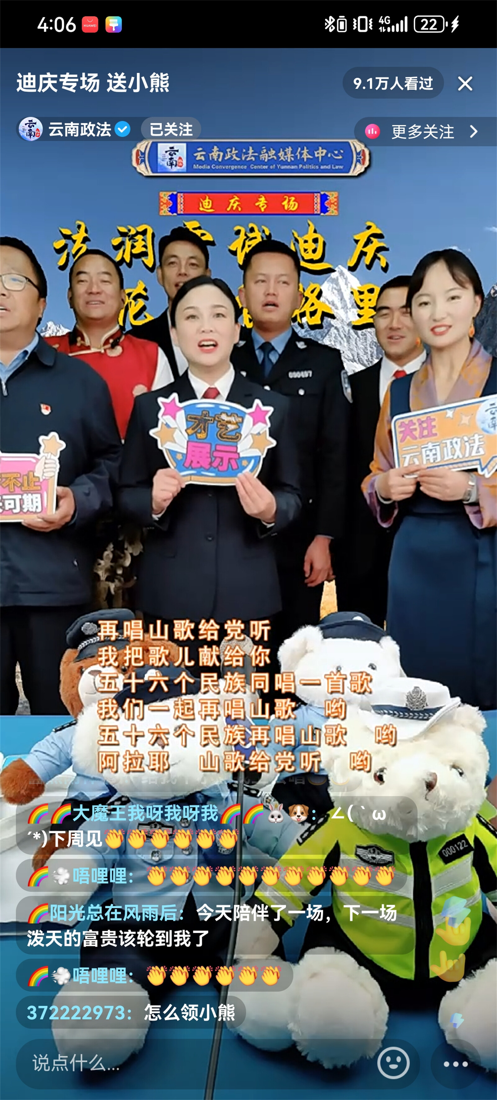 近日,迪慶州政法干警走進云南政法普法強基直播間開展“法潤雪域迪慶、花開香格里拉”迪慶州普法專場直播,直播聚焦群眾關(guān)切,緊密聯(lián)系時事熱點,帶廣大網(wǎng)友體驗了一場內(nèi)容豐富的普法之旅,共吸引9.1萬人觀看,獲點贊超10.4萬。