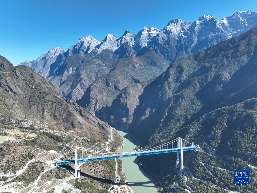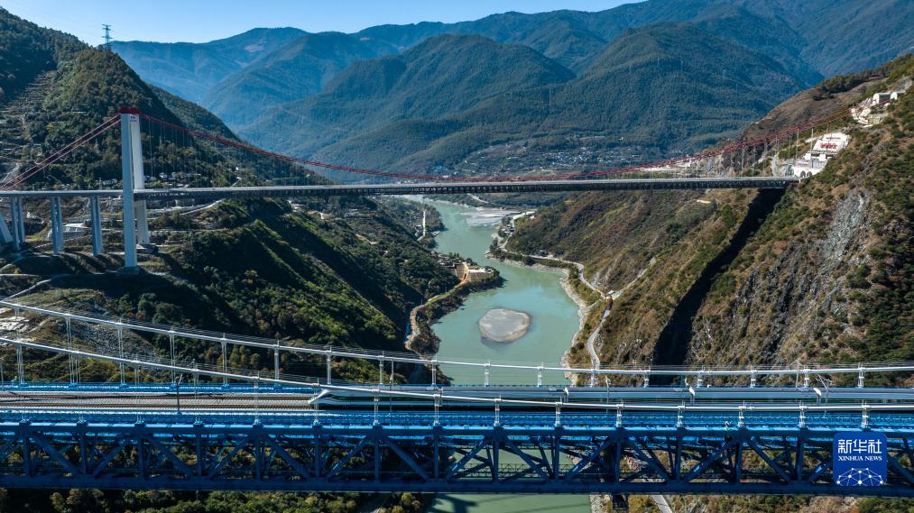 11月26日,列車駛過虎跳峽金沙江鐵路大橋(無人機照片)。新華社記者 胡超 攝