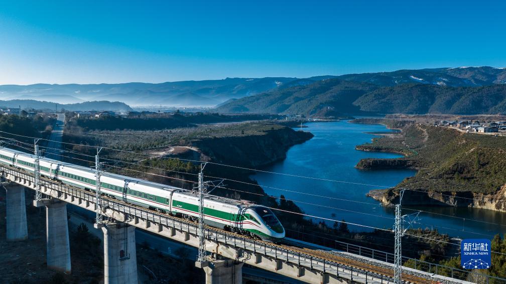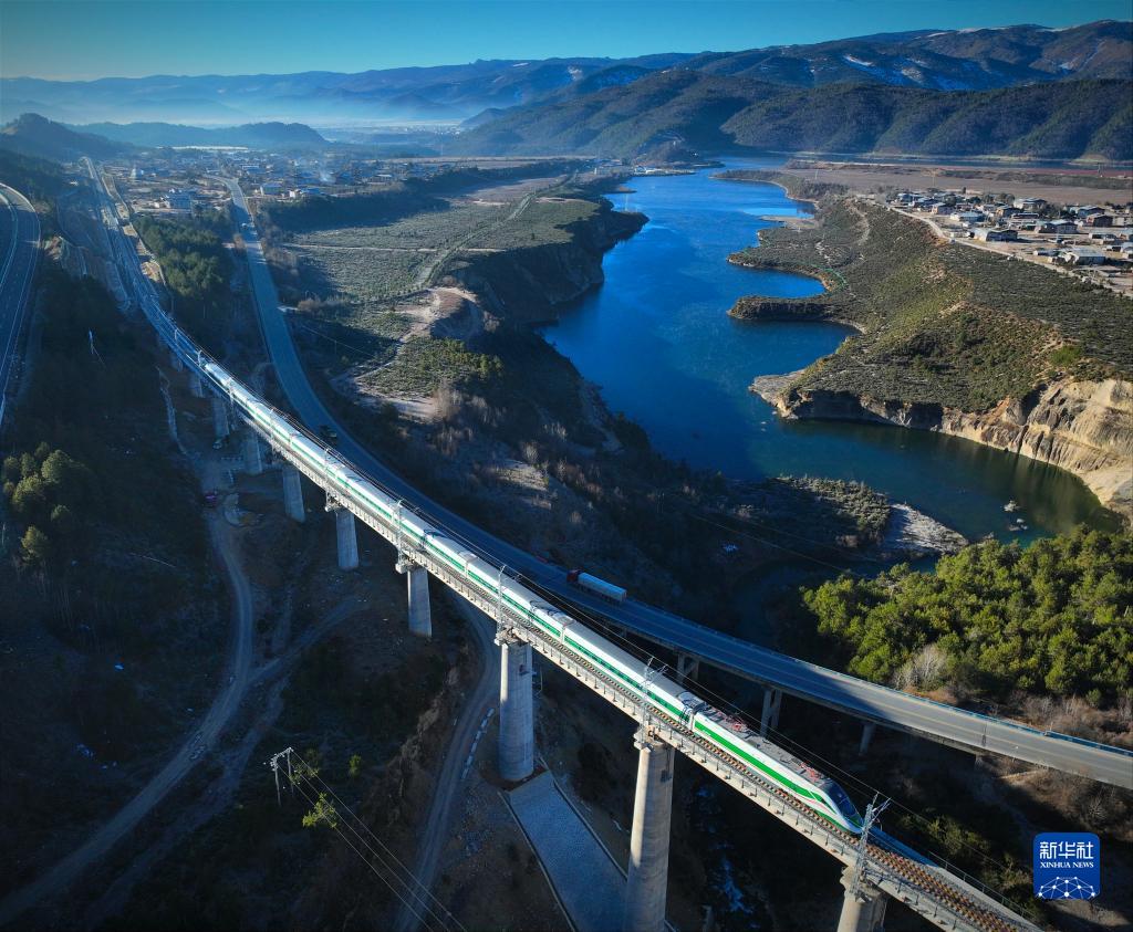 11月26日,列車行駛在麗香鐵路線上(無人機照片)。新華社記者 胡超 攝