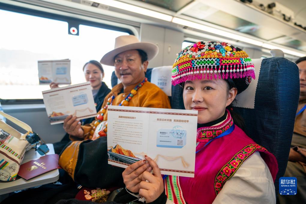 11月26日,乘坐麗香鐵路開通首發(fā)列車的嘉賓在車廂內展示紀念車票。新華社記者 陳欣波 攝