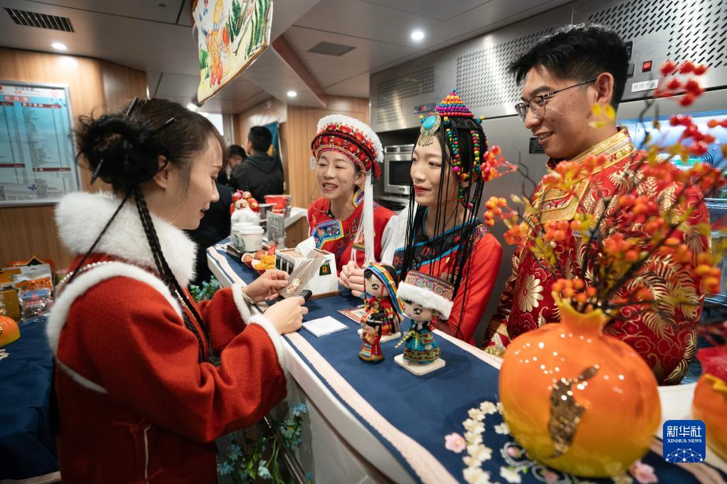 11月26日,乘坐麗香鐵路首發(fā)列車的乘客(左)向列車乘務員咨詢紀念品。新華社記者 陳欣波 攝