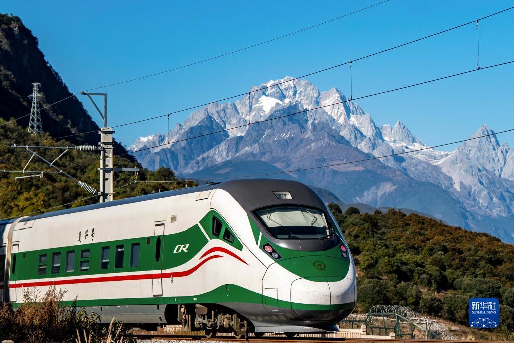 11月26日,列車從玉龍雪山腳下駛過。新華社記者 胡超 攝