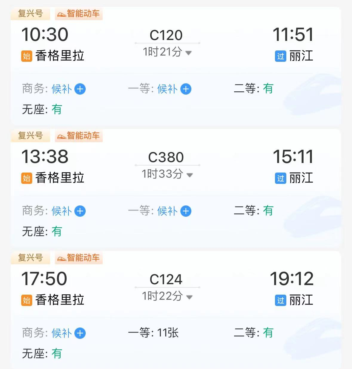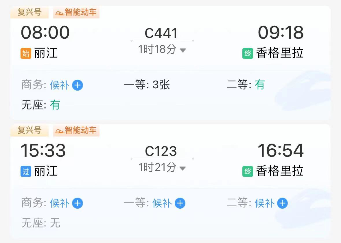 根據(jù)中國鐵路官方售票平臺-鐵路12306上的查詢結(jié)果,目前,麗江-香格里拉段每日共發(fā)出兩趟班次,最快1小時18分到達(dá)香格里拉站;香格里拉-麗江段每日共發(fā)出三趟班次,最快1小時21分到達(dá)麗江站。班次設(shè)置合理,基本可以保證上、中、下午時段的不同出行需求。